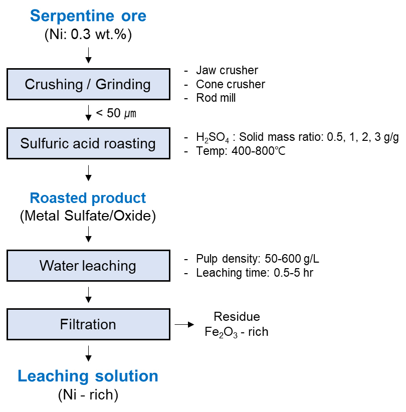 - Korea is entirely dependent on nickel imports, necessitating technologies to utilize domestic nickel ore deposits. This study investigated the selective leaching characteristics of nickel from domestic serpentine-based low-grade nickel ore (Ni: 0.3 wt.%) using a sulfuric acid roasting-water leaching process. The H2SO4-to-solid mass ratio and roasting temperature were the main variables in roasting, whereas pulp density and leaching time were the main variables in water leaching. Analysis of metal leaching behavior revealed optimal conditions: an H2SO4-to-solid mass ratio of 2 g/g and a roasting temperature of 700°C, and a pulp density of 50 g/L with a leaching time of 30 minutes. The results confirmed that roasting temperature is the dominant variable for selective nickel leaching and that a sufficient supply of sulfuric acid, along with appropriate moisture conditions, is essential. These findings demonstrate the applicability of the sulfuric acid roasting-water leaching process to domestic serpentine-based low-grade nickel ore and provide fundamental data for utilizing domestic nickel resources.